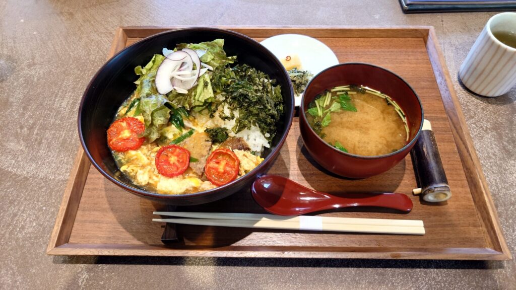 敷地内には、地元・丹後の食材や森で育てた野菜を使った料理が楽しめるレストランがあり、「MORIセット」や「できたて西湖」など、和久傳ならではの食事・カフェメニューが揃っています。テラス席では森を眺めながら食事も可能。ペット連れもOKです(リード必須)。